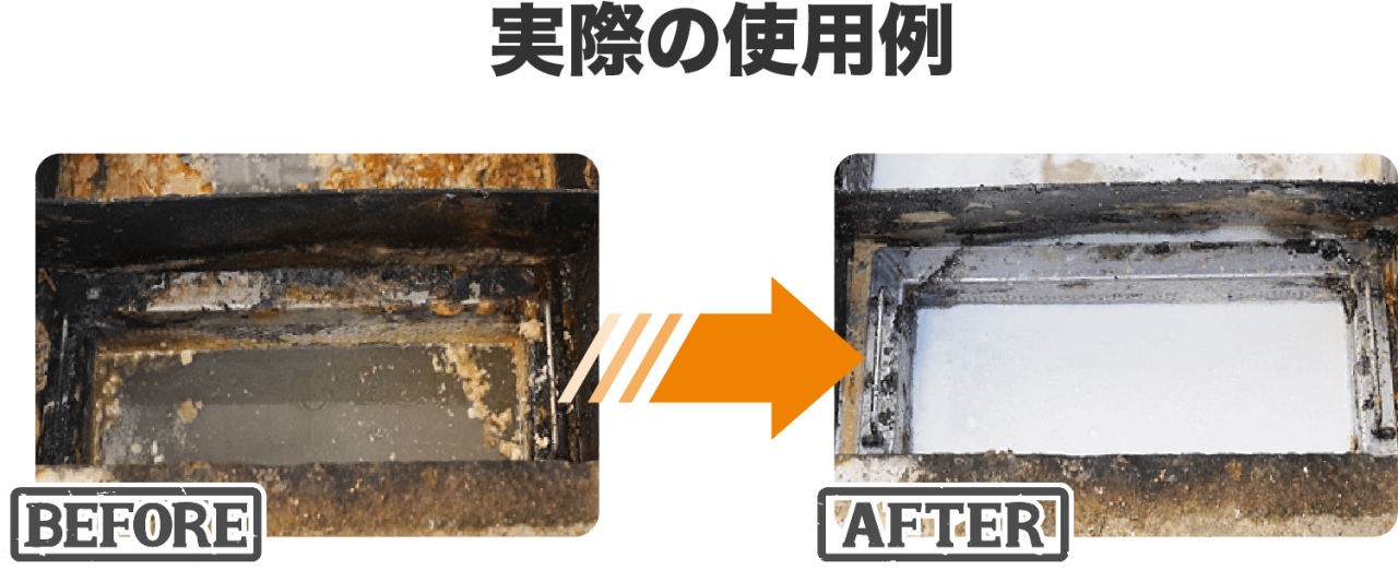 店舗オープンから半年間放置されていた状態からの「美らちゅら」初使用の事例です。 前からの汚れも含めこびり付いた油があり真っ黒な状態、ニオイもかなり出ていましたが、数分の作業で嫌なニオイはほとんど消えました。 ステンレスの枠や壁面にも杓でかけながら混ぜていると、油汚れが自然に取れていきました。 今回の作業中、たわしで擦るなどの作業は一切行わず、ただ混ぜながらかけていただけです。作業時間は30分ほどで完了です。